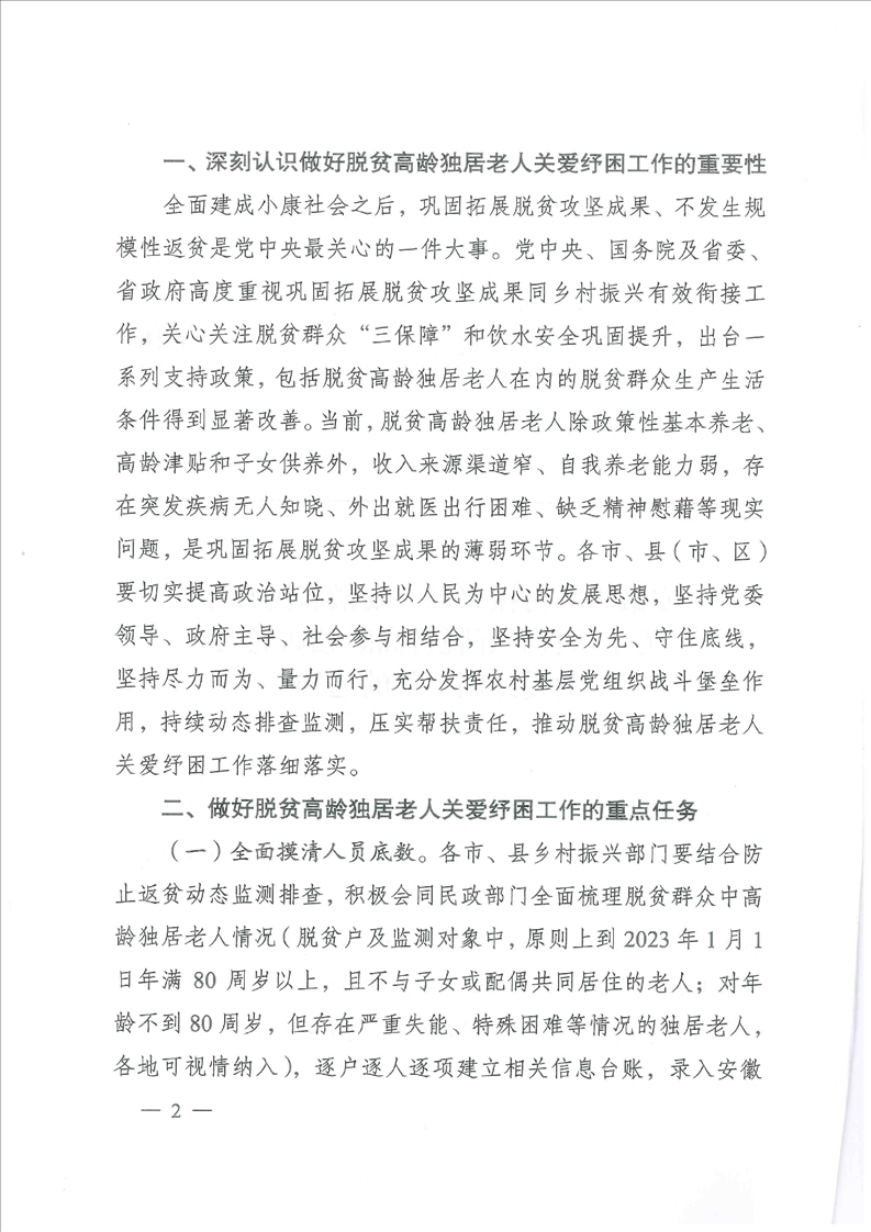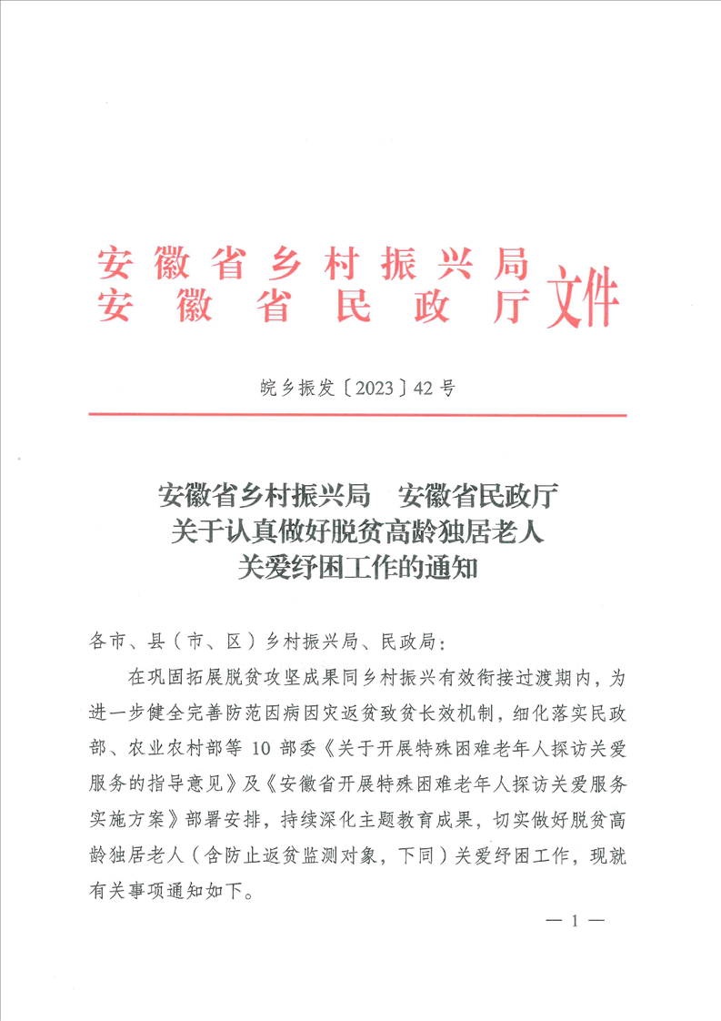 皖鄉(xiāng)振發(fā)【2023】42號關(guān)于做好農(nóng)村地區(qū)脫貧群眾中高齡獨(dú)居老人關(guān)愛關(guān)愛工作的通知