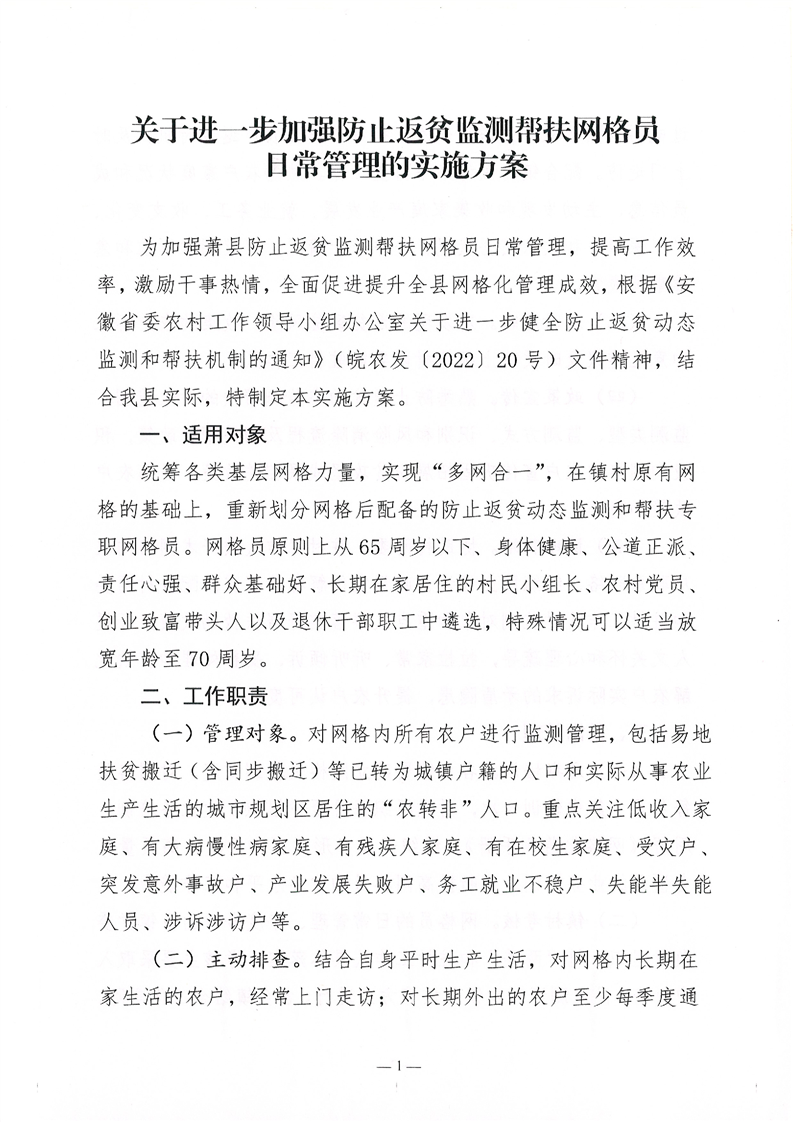 關(guān)于印發(fā)《關(guān)于進一步加強防止返貧監(jiān)測幫扶網(wǎng)格員日常管理的實施方案》的通知