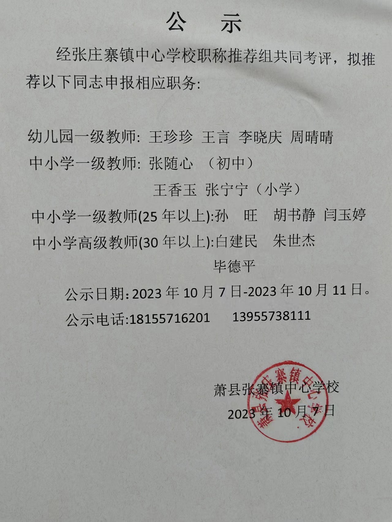【擬推薦人選名單】張莊寨鎮(zhèn)2023年度中心校擬推薦高級、一級教師人員名單公示