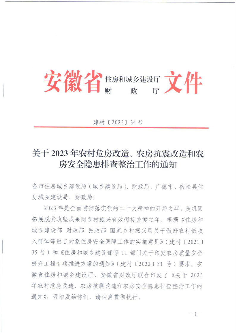 安徽省住房城鄉(xiāng)建設(shè)廳安徽省財(cái)政廳《關(guān)于2023年農(nóng)村危房改造、農(nóng)房抗震改造和農(nóng)房安全隱患排查整治工作的通知》