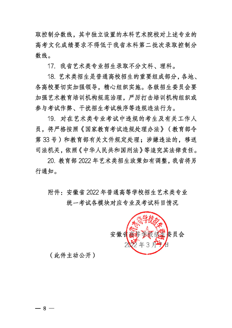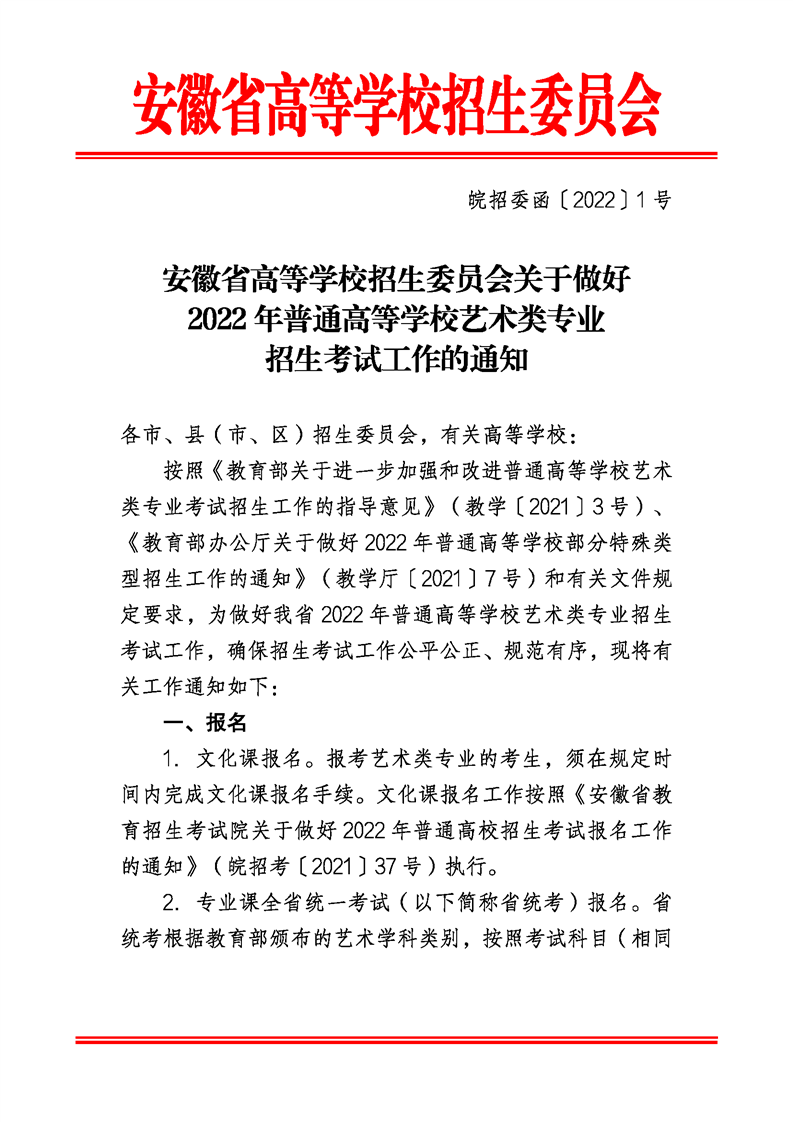 安徽省高等學(xué)校招生委員會關(guān)于做好2022年普通高等學(xué)校藝術(shù)類專業(yè)招生考試工作的通知