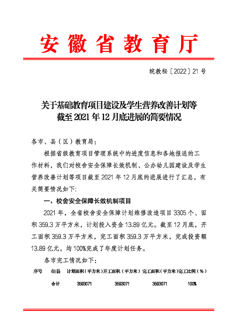 關(guān)于基礎(chǔ)教育項目建設(shè)及學(xué)生營養(yǎng)改善計劃等截至2021年12月底進展的簡要情況
