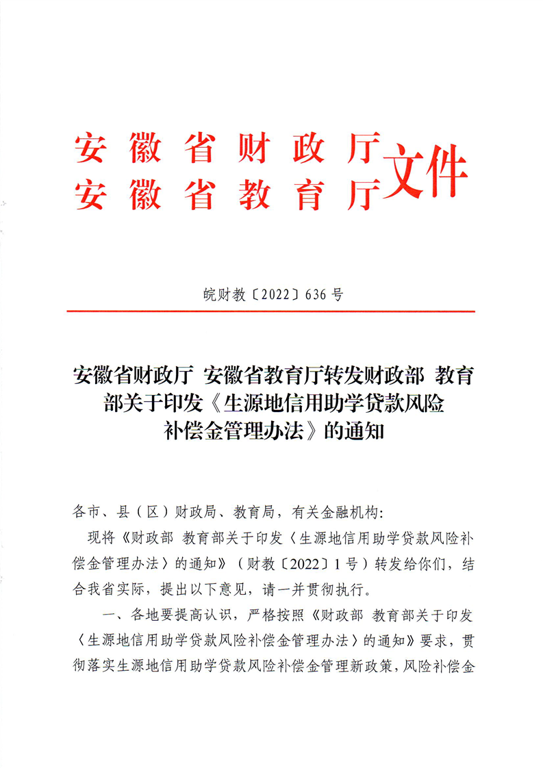 安徽省財(cái)政廳安徽省教育廳轉(zhuǎn)發(fā)財(cái)政部教育部關(guān)于印發(fā)《生源地信用助學(xué)貸款風(fēng)險(xiǎn)補(bǔ)償金管理辦法》的通知
