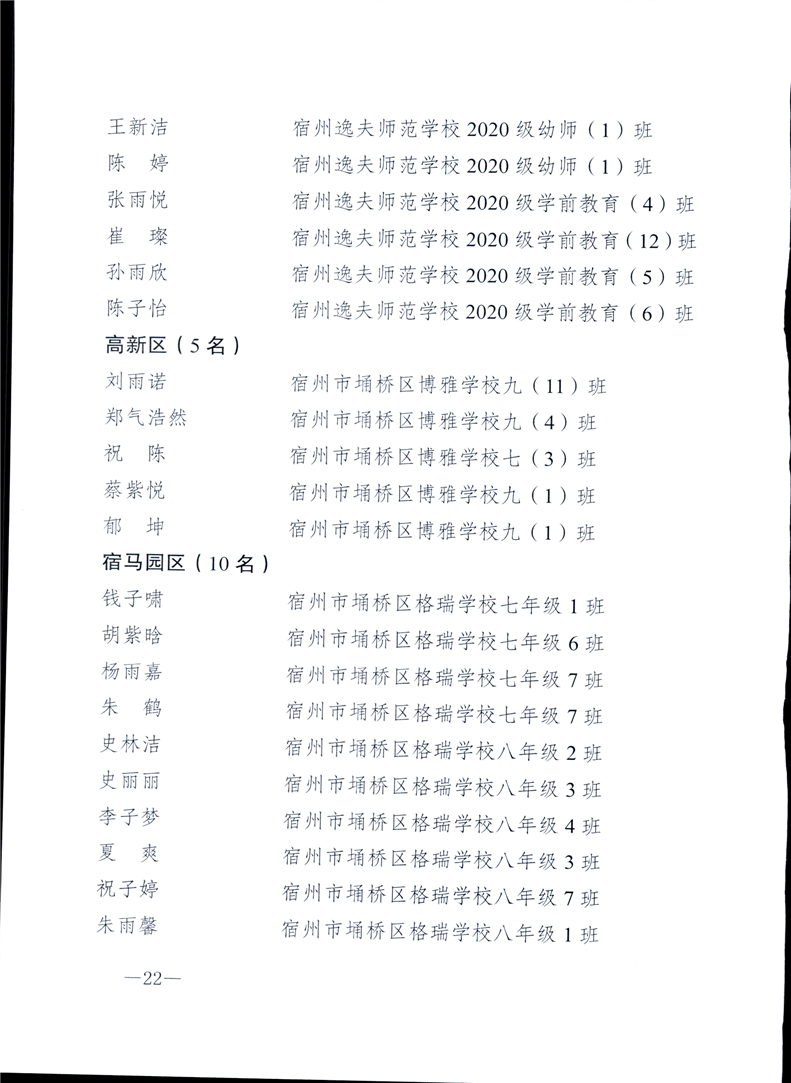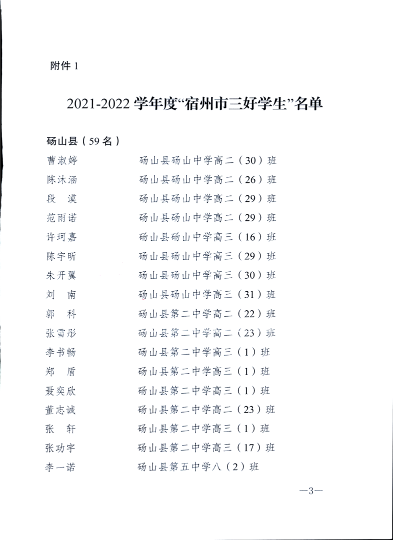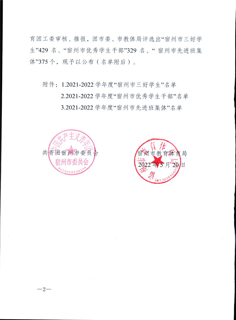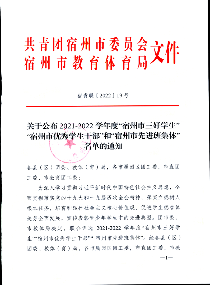關(guān)于公布2021-2022學(xué)年度“宿州市三好學(xué)生”“宿州市優(yōu)秀學(xué)生干部”和“宿州市先進班集體”名單的通知