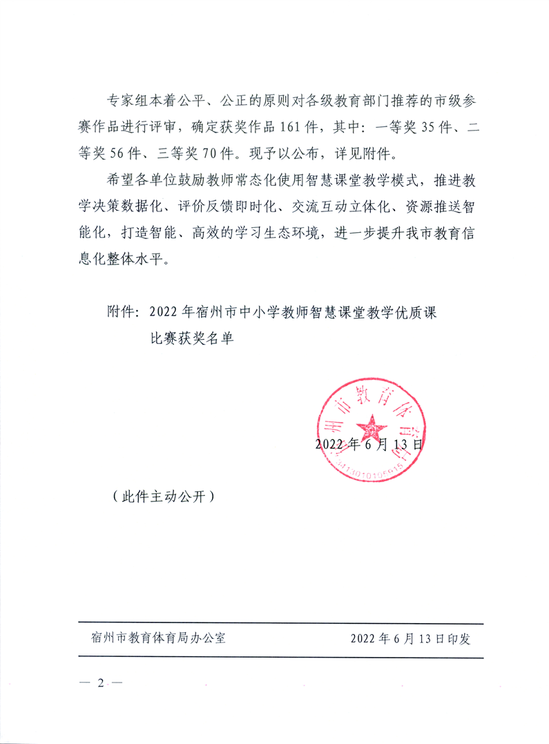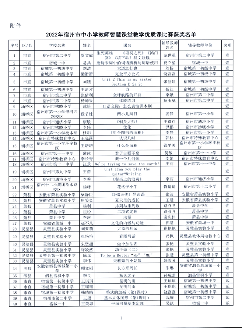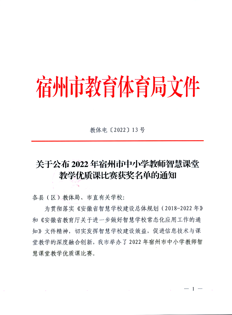 關于公布2022年宿州市中小學教師智慧課堂教學優(yōu)質(zhì)課比賽獲獎名單的通知