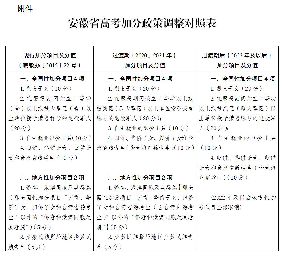 2.地方性加分項目2項。即僑眷、港澳同胞及其眷屬(5分),少數(shù)民族聚居地區(qū)少數(shù)民族考生(我省享受高考政策加分的少數(shù)民族聚居地區(qū)名單詳見《安徽省調(diào)整和規(guī)范高考加分工作實施方案》)(5分)。