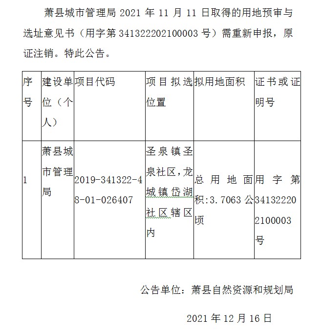蕭縣城市管理局用地預(yù)審與選址意見書注銷公告(用字第341322202100003號(hào))