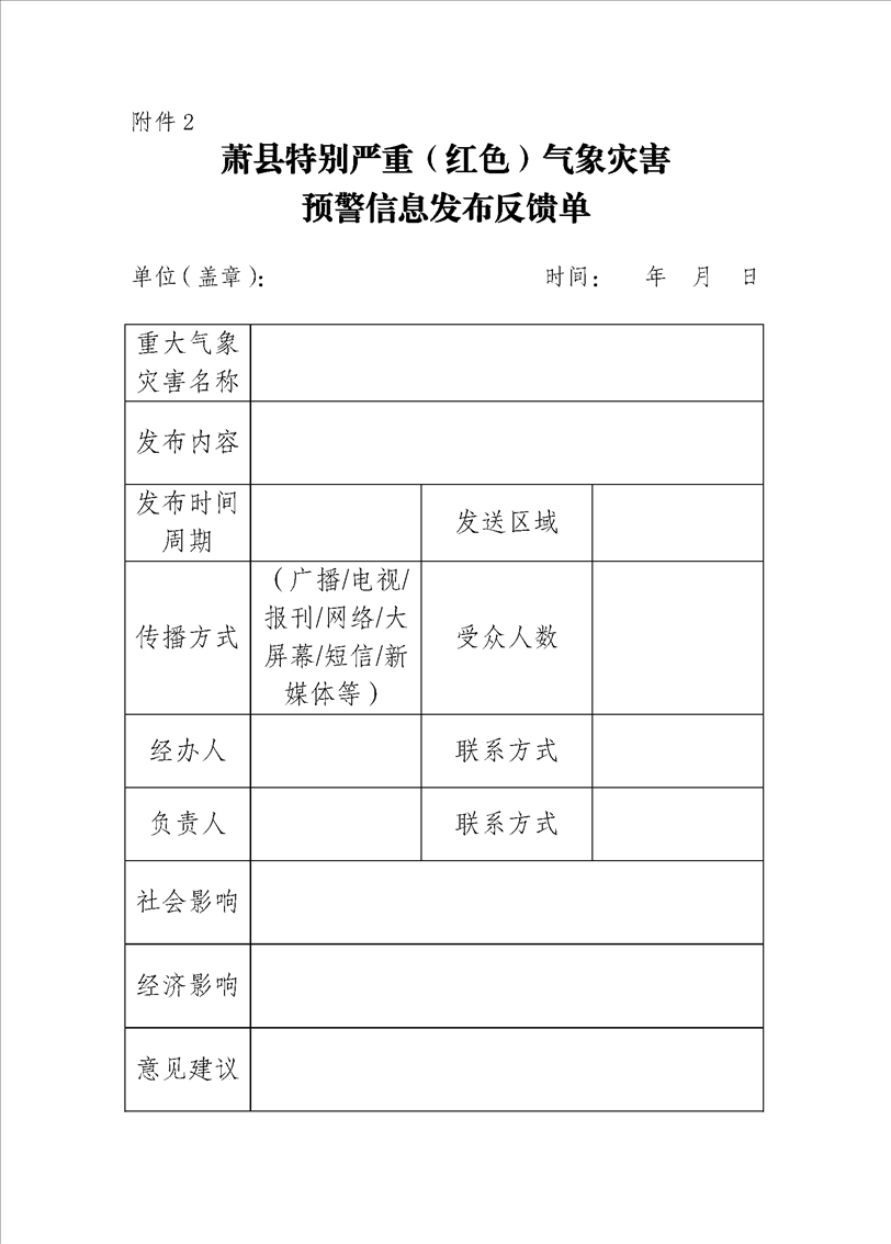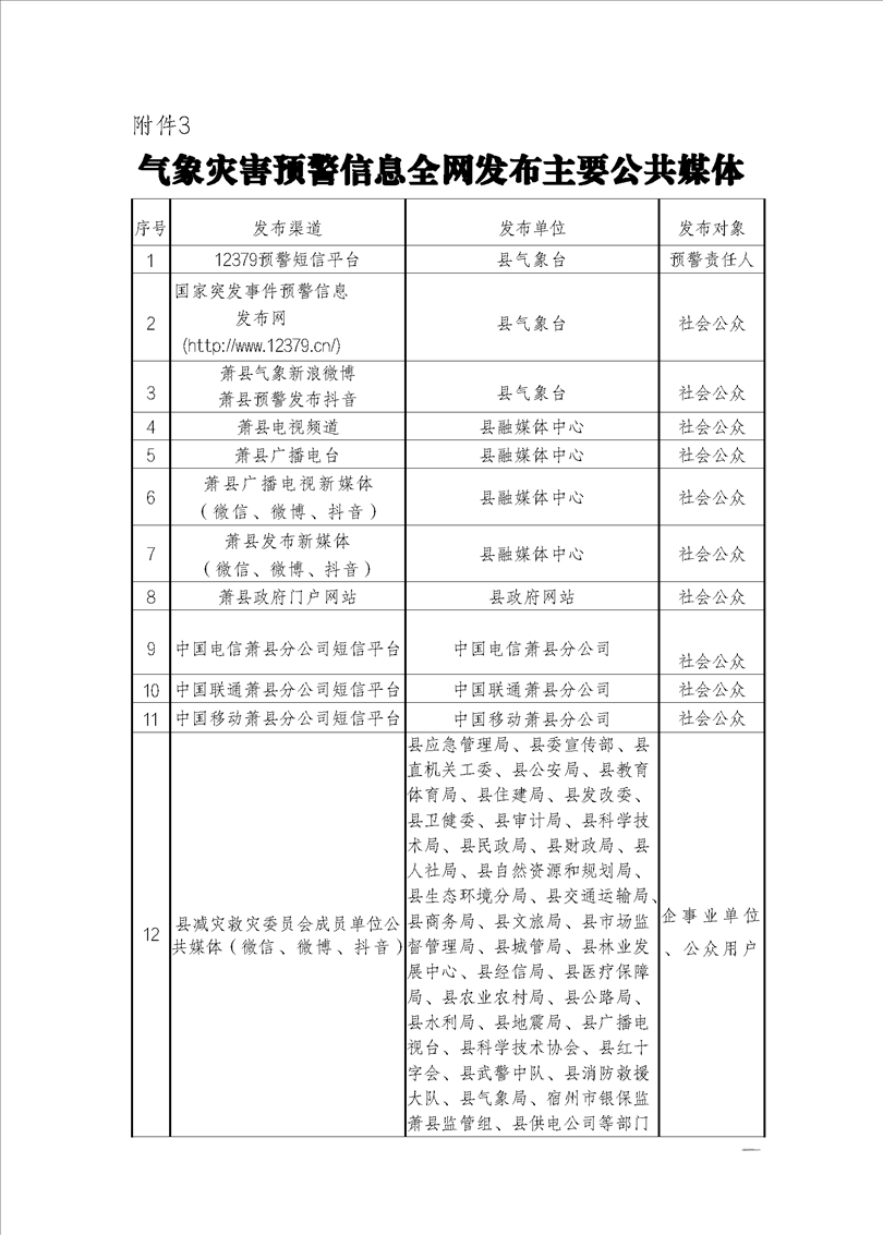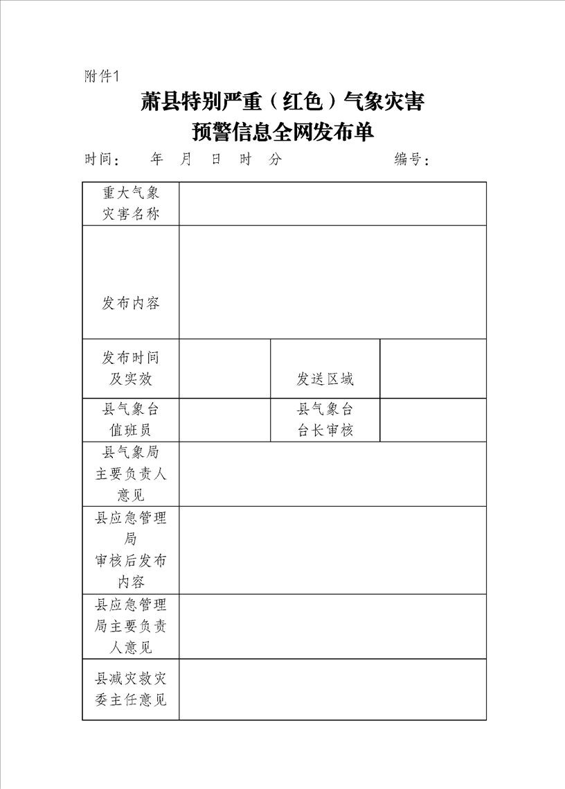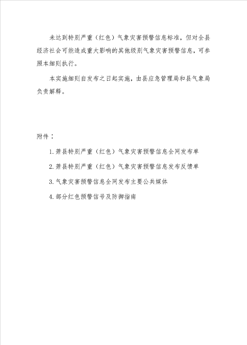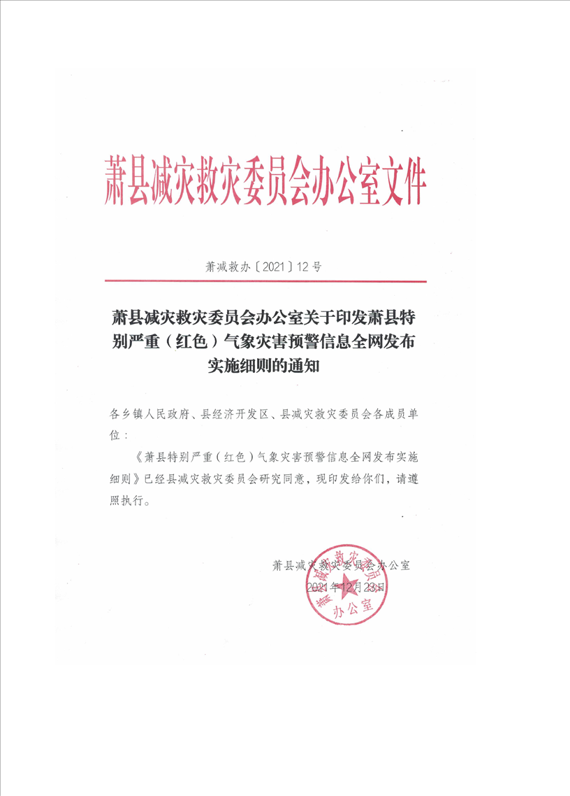 蕭縣減災(zāi)救災(zāi)委員會(huì)辦公室關(guān)于印發(fā)蕭縣特別嚴(yán)重(紅色)氣象災(zāi)害預(yù)警信息全網(wǎng)發(fā)布實(shí)施細(xì)則的通知