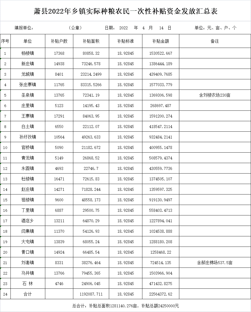 蕭縣2022年鄉(xiāng)鎮(zhèn)實(shí)際種糧農(nóng)民一次性補(bǔ)貼(第一批)資金發(fā)放匯總表