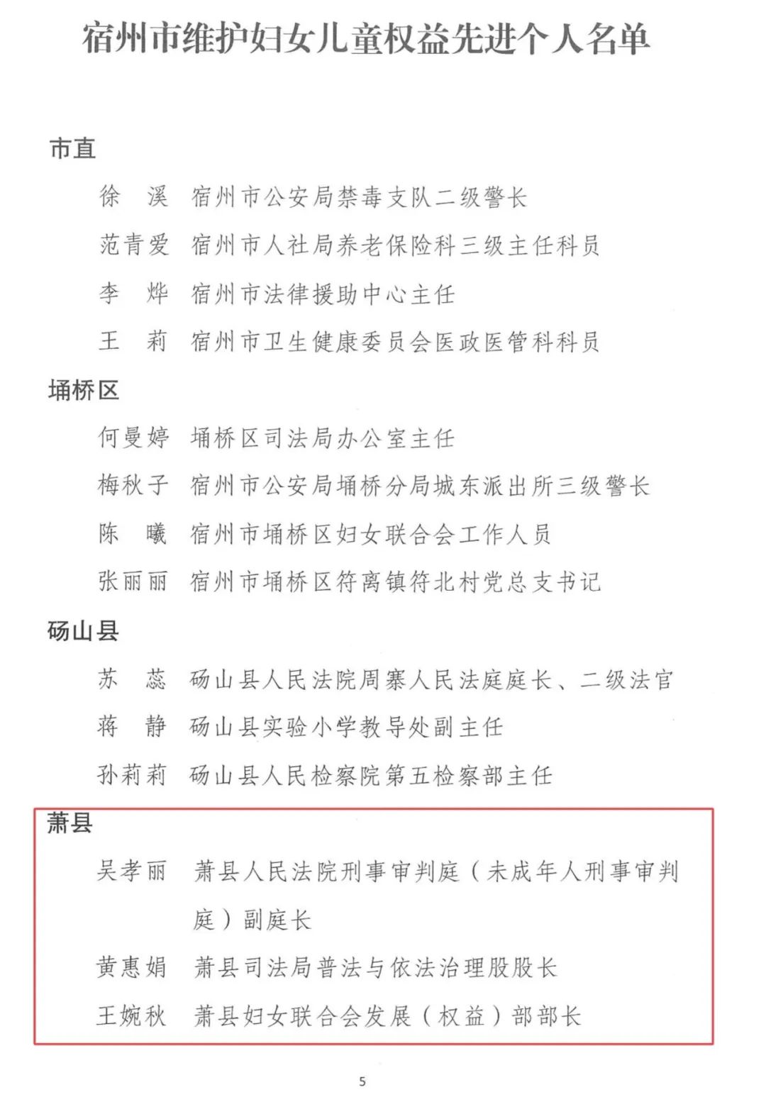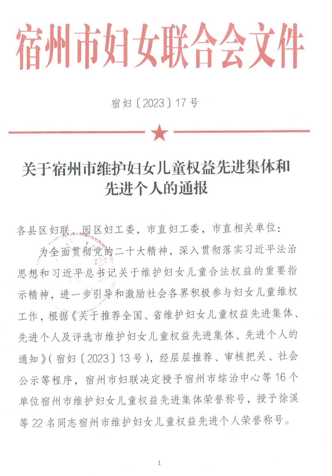 近日,宿州市婦女聯(lián)合會發(fā)布《關(guān)于宿州市維護(hù)婦女兒童權(quán)益先進(jìn)集體和先進(jìn)個(gè)人的通報(bào)》(宿婦〔2023〕17號),授予全市16個(gè)單位“宿州市維護(hù)婦女兒童權(quán)益先進(jìn)集體”和22位同志“宿州市維護(hù)婦女兒童權(quán)益先進(jìn)個(gè)人”榮譽(yù)稱號。蕭縣2個(gè)集體、3名個(gè)人榜上有名!