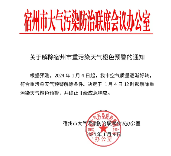 關(guān)于解除宿州市重污染天氣橙色預警的通知