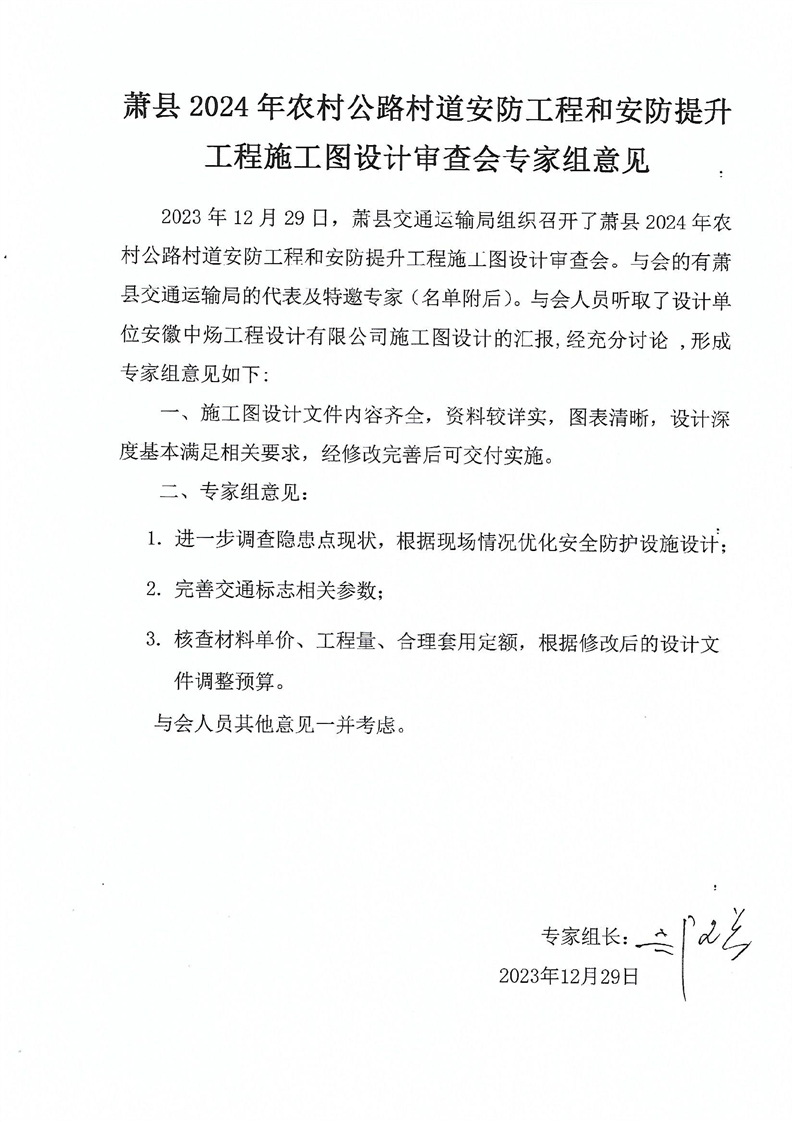 你中心報(bào)來的《關(guān)于報(bào)請(qǐng)審批2024年蕭縣農(nóng)村公路村道安全防護(hù)和安防提升工程施工圖設(shè)計(jì)文件的請(qǐng)示》,我局于2023年12月29日組織有關(guān)專家對(duì)2024年蕭縣農(nóng)村公路村道安全防護(hù)和安防提升工程項(xiàng)目施工圖設(shè)計(jì)文件審查,根據(jù)專家組提出的評(píng)審意見(附后),設(shè)計(jì)單位(安徽中煬工程設(shè)計(jì)有限公司)進(jìn)行修改和完善,現(xiàn)批復(fù)如下: