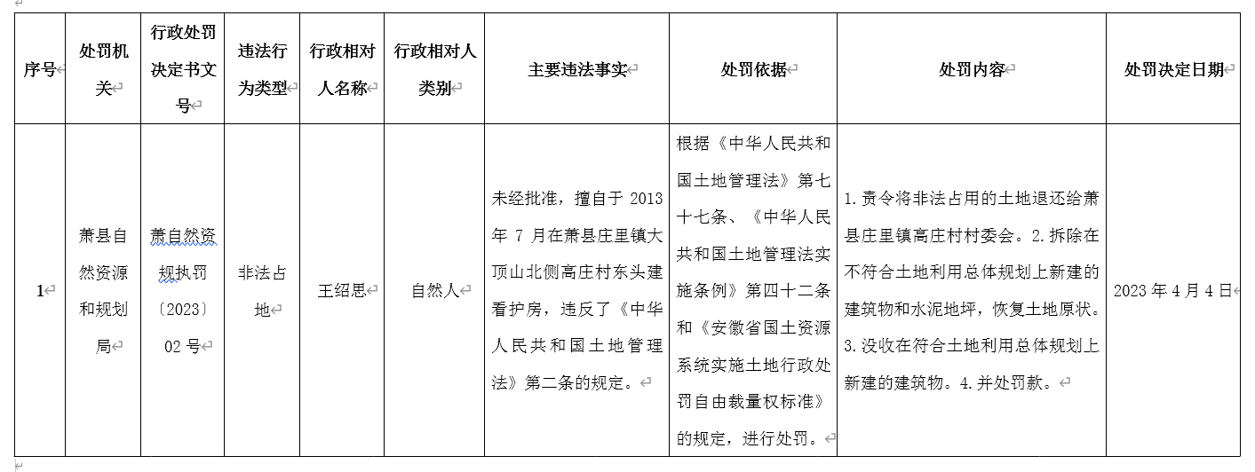 蕭縣自然資源和規(guī)劃局2023年行政處罰案件(一)