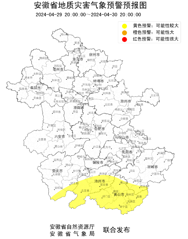 2024年4月29日20時-4月30日20時,發(fā)布地質(zhì)災(zāi)害黃色預(yù)警:黃山市全境,池州市全境,安慶市的宿松縣、望江縣,宣城市的旌德縣、績溪縣發(fā)生地質(zhì)災(zāi)害的可能性較大,請注意防范,并加強隱患巡查和排查,一旦發(fā)現(xiàn)隱患,提前避險轉(zhuǎn)移。