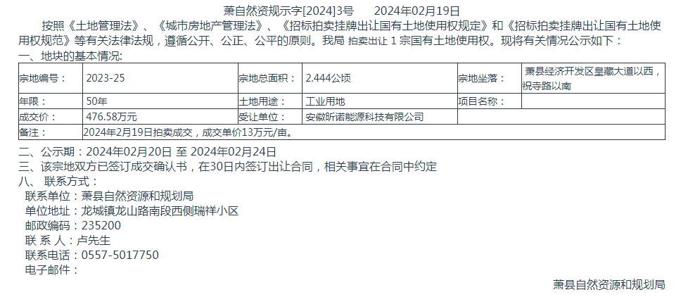 蕭縣自然資源和規(guī)劃局國有土地使用權(quán)招拍掛出讓成交公示蕭自然資規(guī)示字[2024]3號(hào)