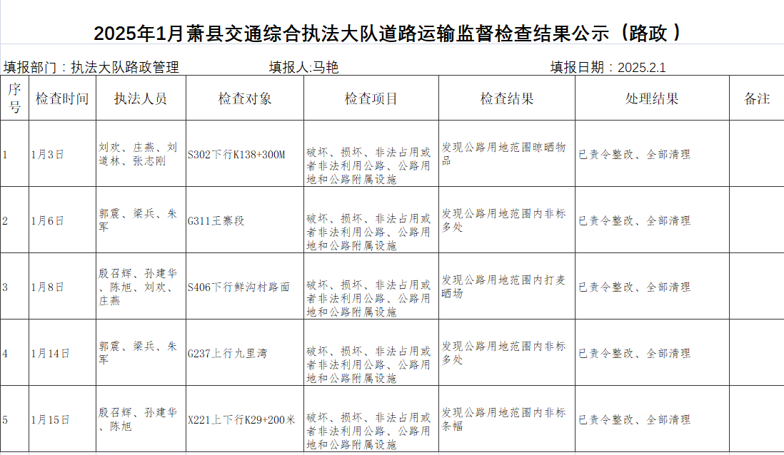 2025年1月交通綜合行政執(zhí)法大隊(duì)道路運(yùn)輸監(jiān)督檢查結(jié)果公示(路政)