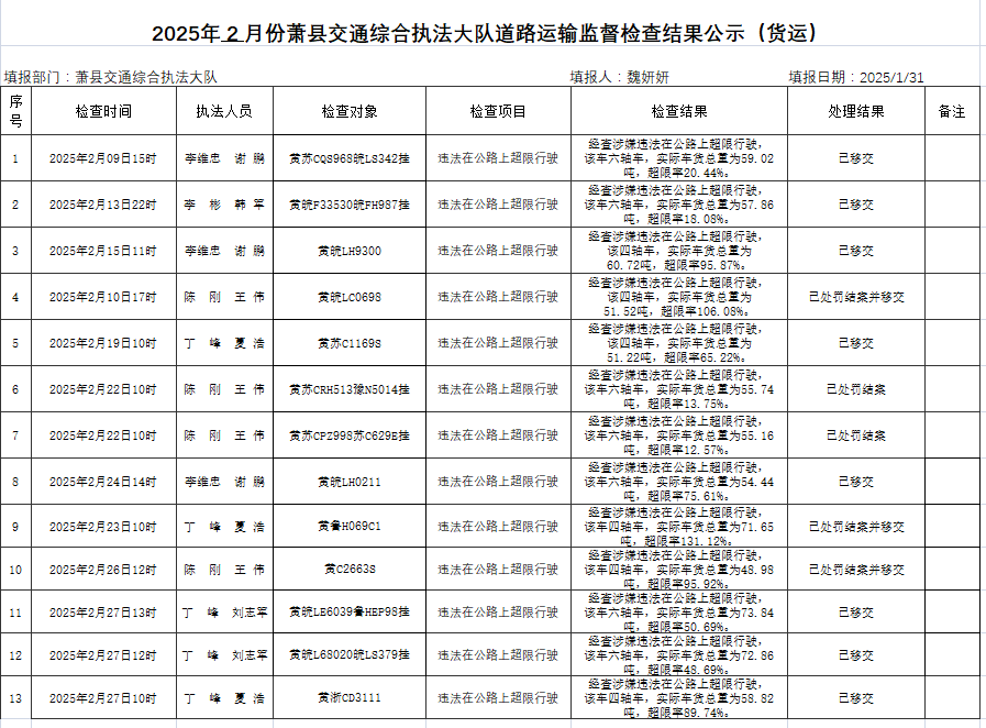 2025年2月交通綜合行政執(zhí)法大隊道路運(yùn)輸監(jiān)督檢查結(jié)果公示(貨運(yùn))