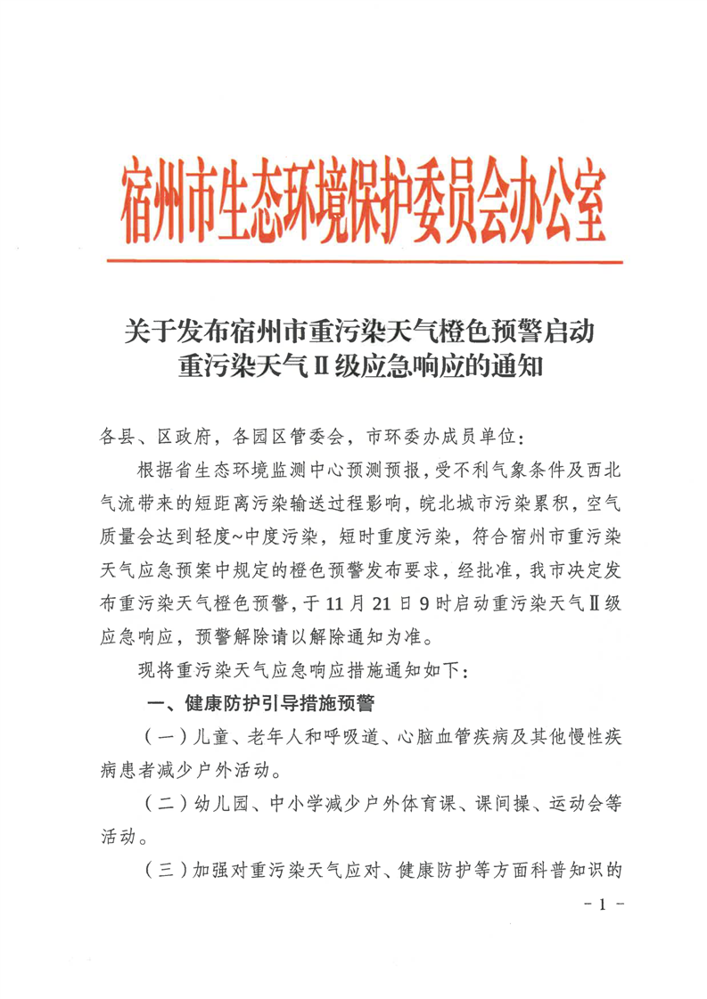 關(guān)于發(fā)布宿州市重污染天氣橙色預(yù)警啟動(dòng)重污染天氣Ⅱ級(jí)應(yīng)急響應(yīng)的通知
